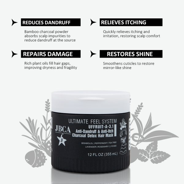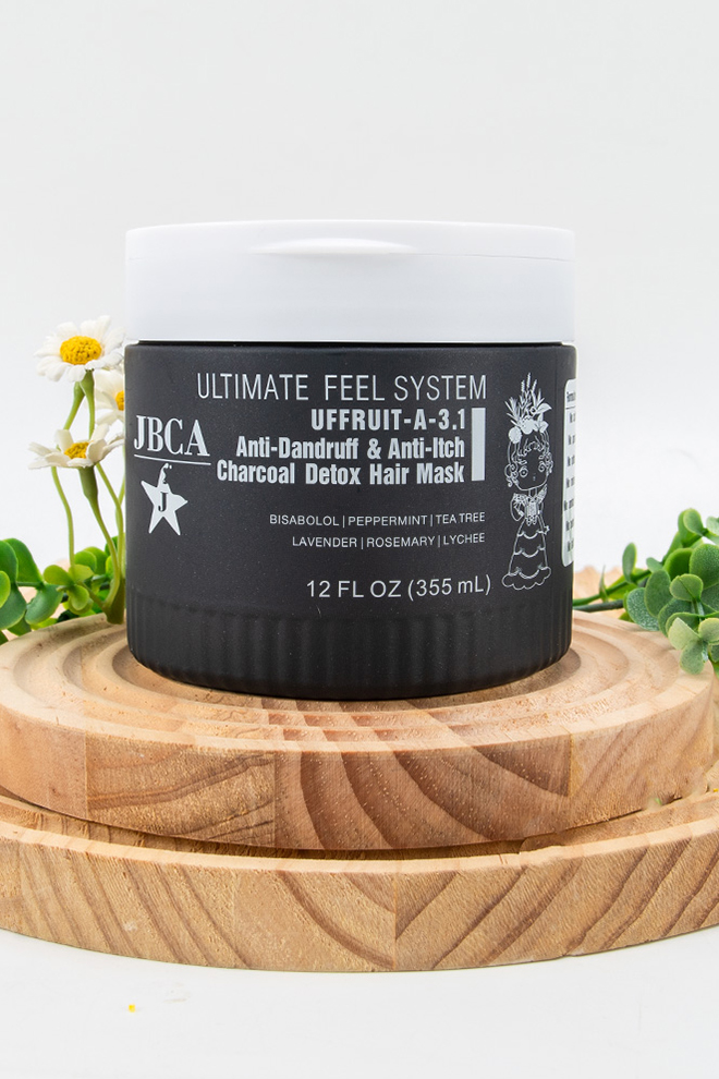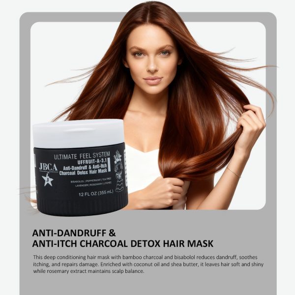 The Anti-dandruff & Anti-itch charcoal detox hair mask is designed to deeply condition hair while detoxifying the scalp and reducing visible dandruff. Formulated with bamboo charcoal powder, seaweed, bisabolol, vitamins B3 and B6, and botanical extracts, it helps relieve itching, calm irritation, balance the scalp, and nourish hair roots and follicles.